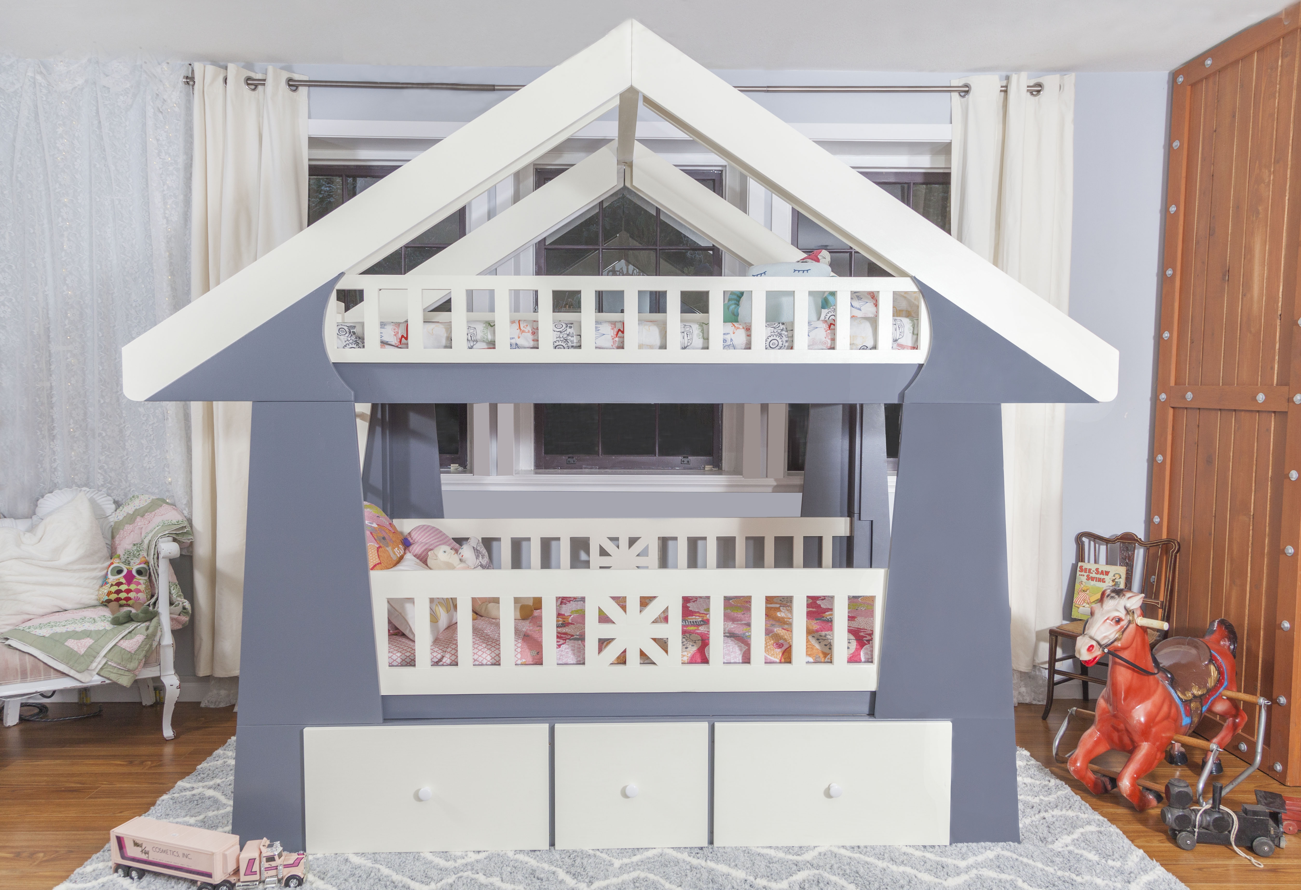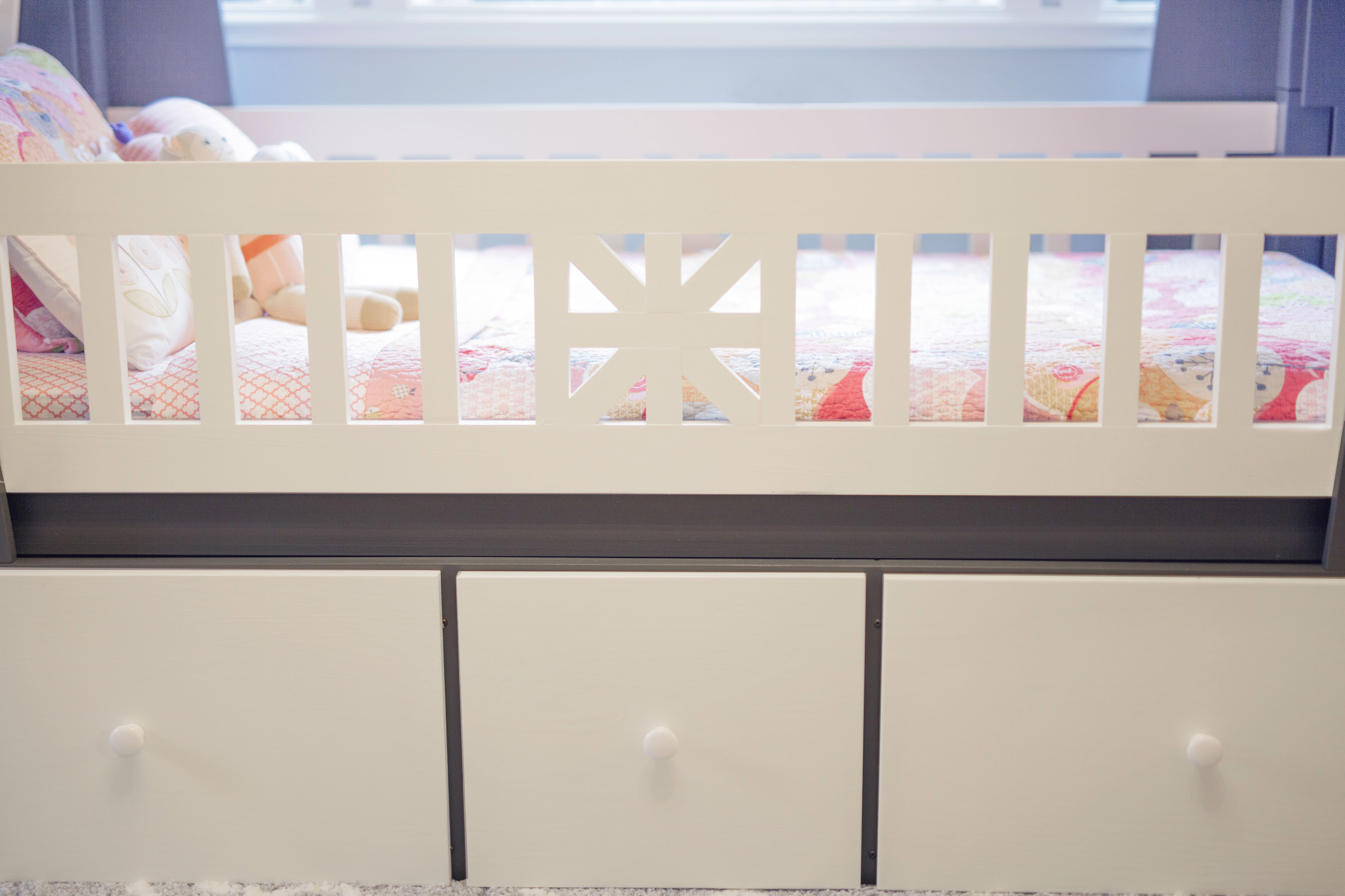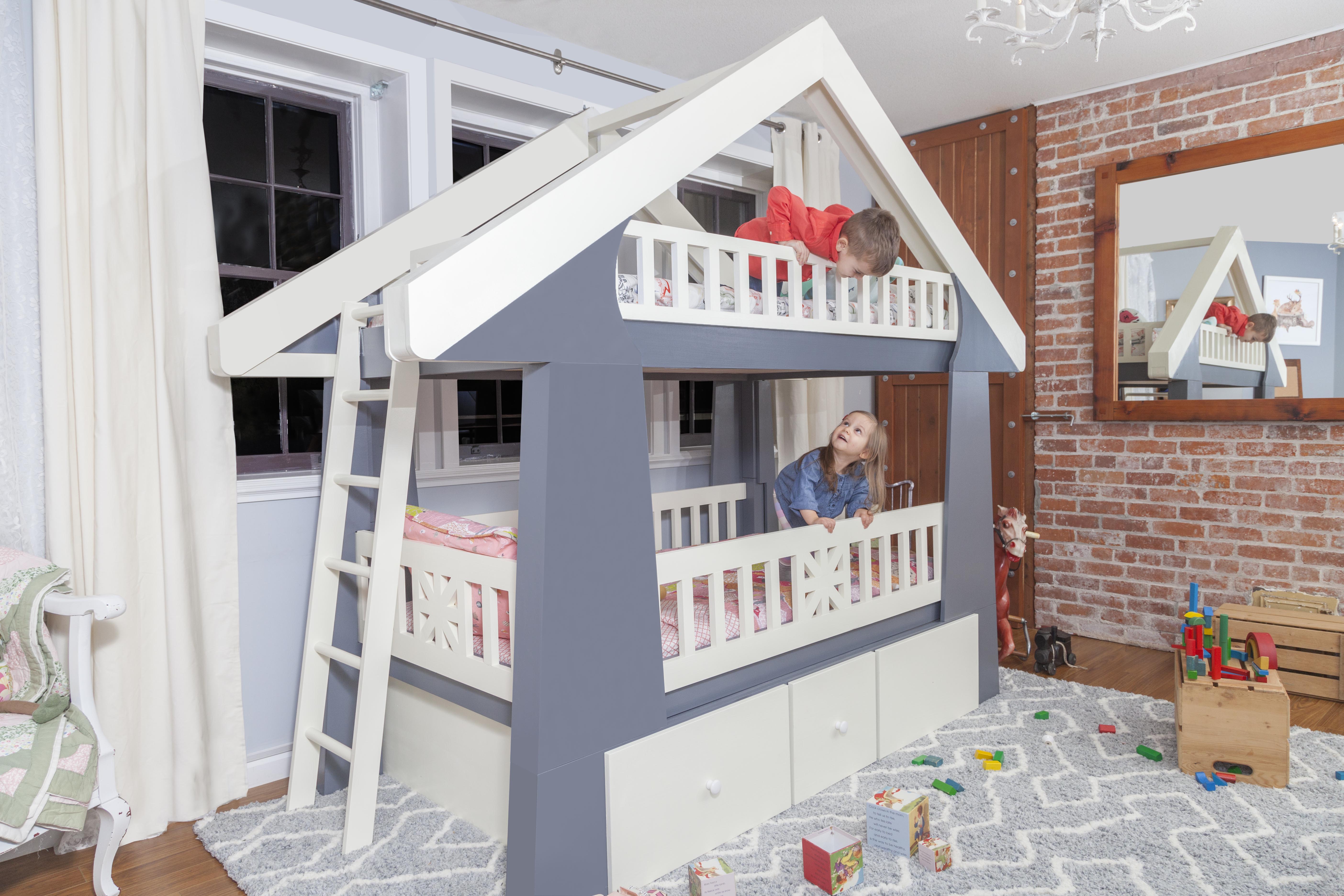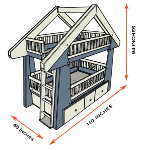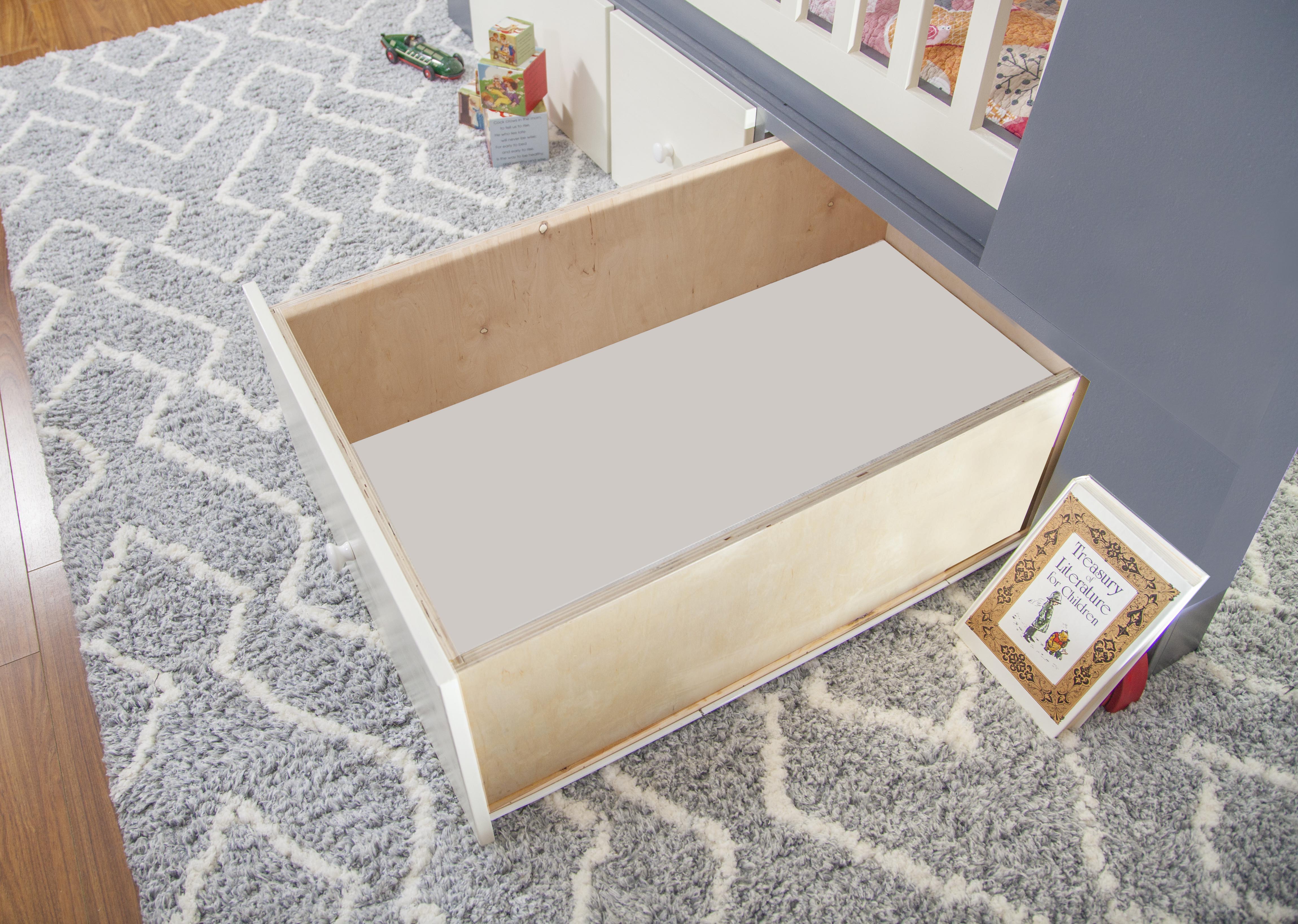 The Craftsman Bed includes all parts required for each mode (bunk-bed, or single open-concept). The bunk-bed mode utilizes the ladder, upper guardrails, and slats, allowing 2 children to sleep comfortably. The single sleeper, open-concept mode creates a brighter, more open environment for one child to enjoy. The lower compartment of the Craftsman provides three massive drawer units totaling 490 liters (17.3 cubic feet) of storage capacity for things such as clothing and toys. Each drawer is equipped with heavy duty sliders that easily slide in and out for easy access to contents, giving 3 feet of leeway for each compartment between open and closed positions.
