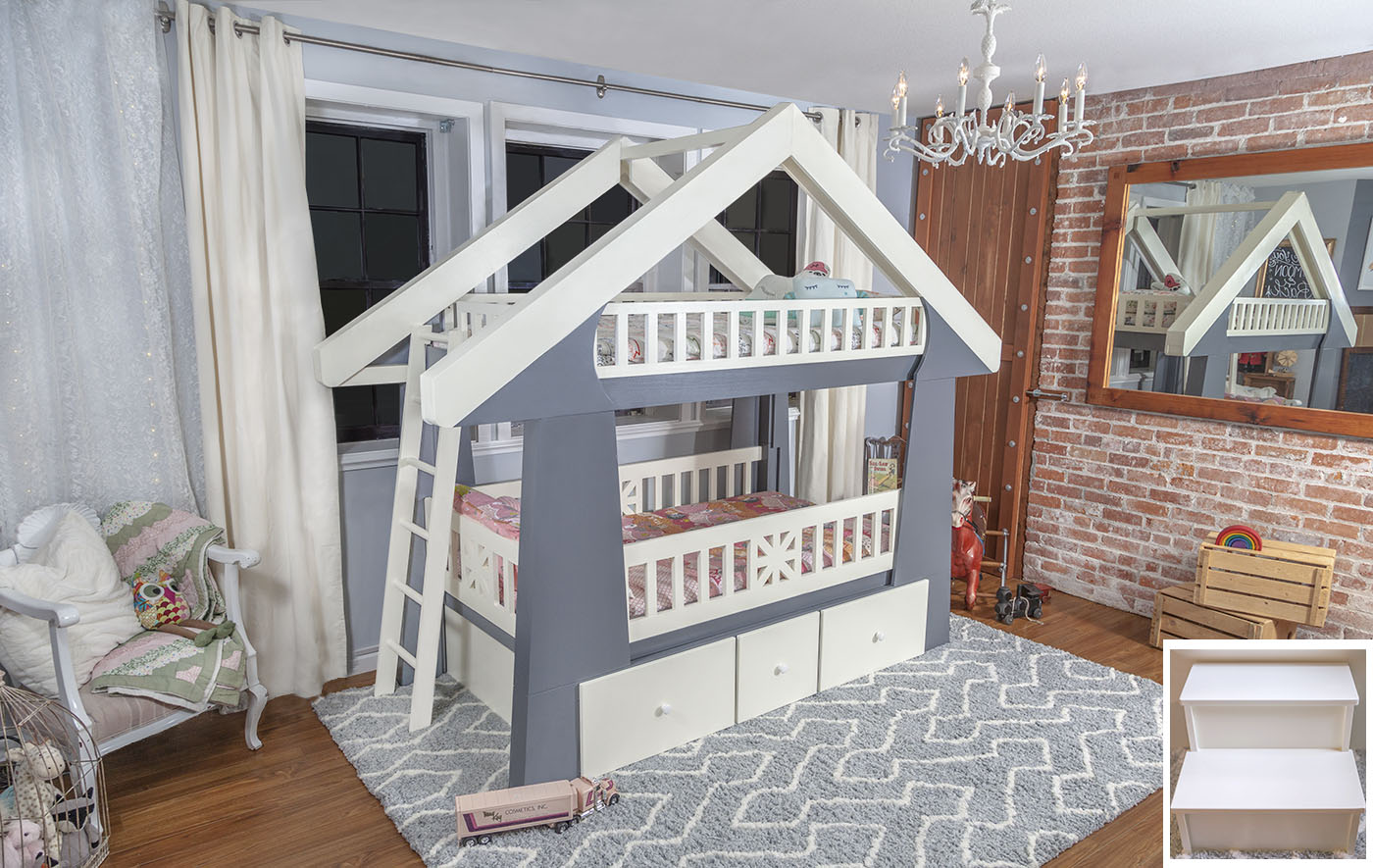 Additionally, very important safety features that are aesthetically appealing have been integrated into the Craftsman bed design which easily distinguishes itself from other children’s furniture lines. For starters, beautiful porch-like guardrails, rounded corners, superior strength, and matching step-stool and ladder.